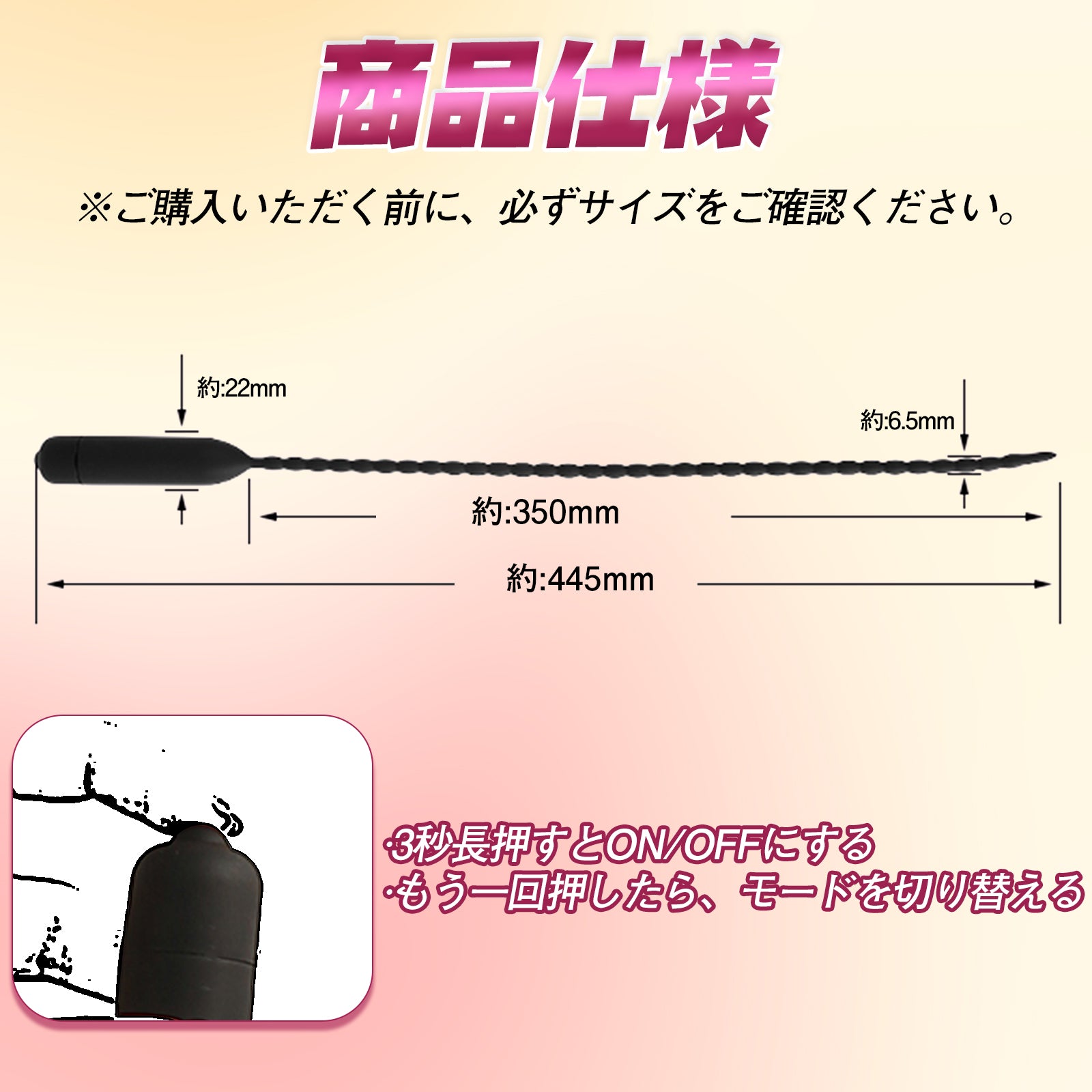 サイズ:最大直径は約6.5mm、可挿入長さは約350mmで、全長は約445mmです。※ご購入いただく前に、必ずサイズをご確認ください。