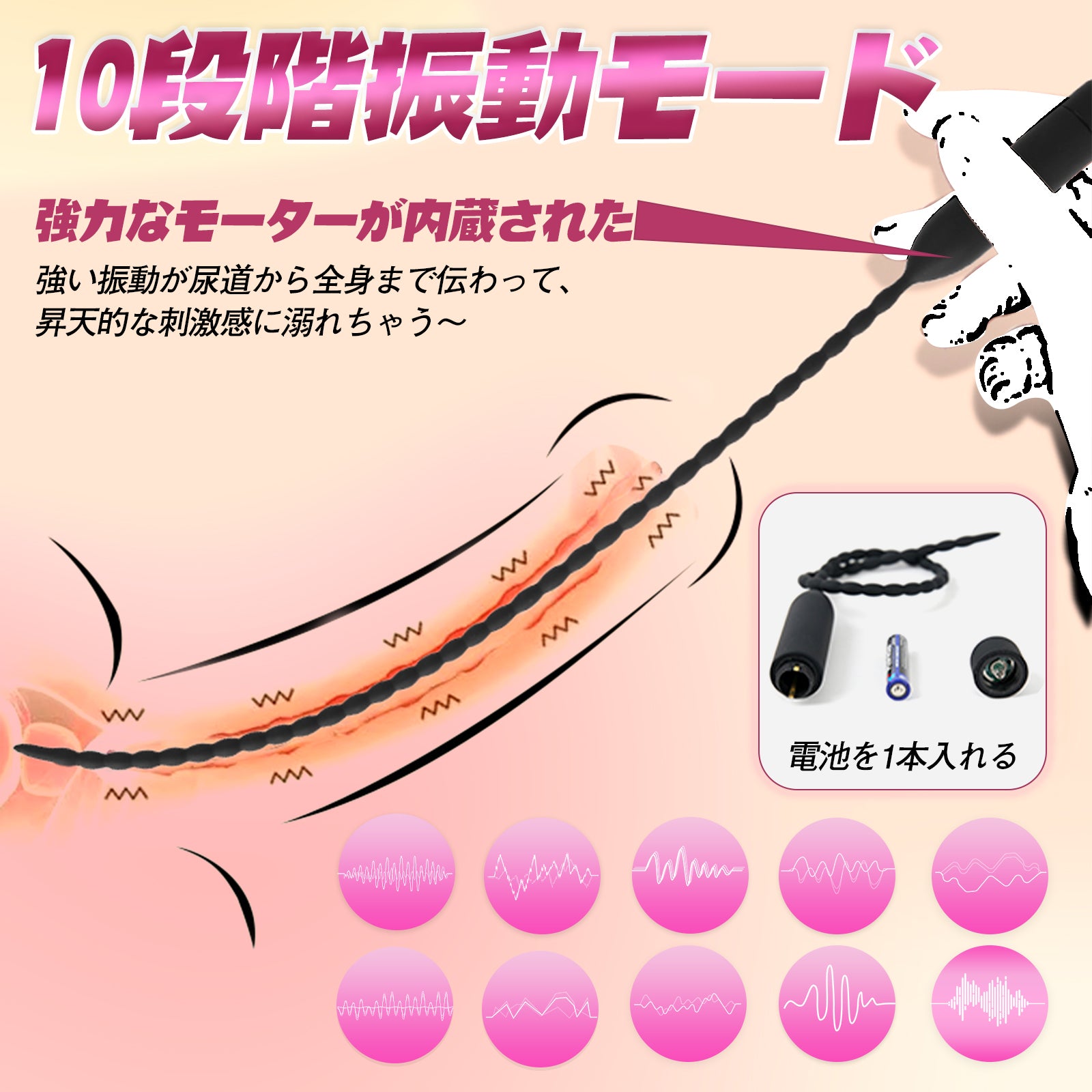10段階振動モード:ビーズだけではなく、強力モーターが持ち手部分に内蔵されたため、強い振動が尿道から全身まで伝わって、昇天的な刺激感に溺れちゃう~10段階振動モードを持っているので、10種類の刺激感を存分に楽しめてどう遊んで飽きたことがありません。