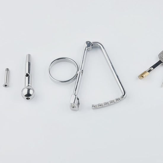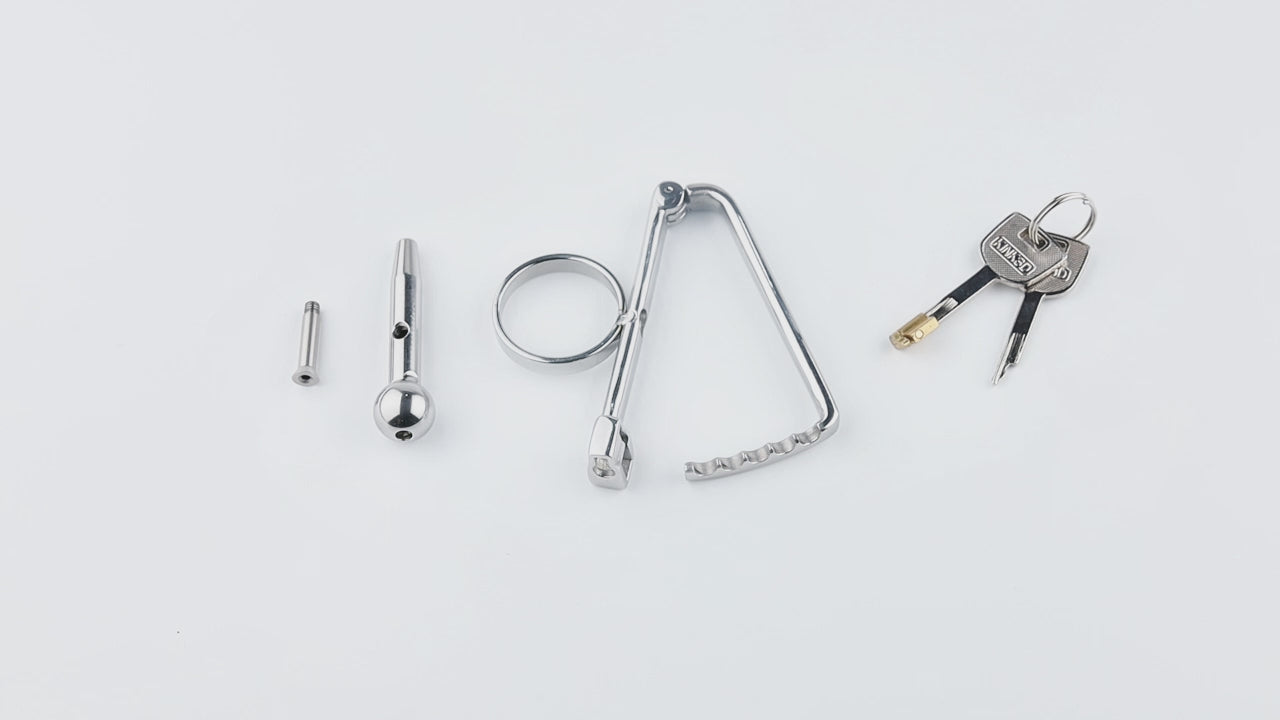 装着方法:1、円形リング部分をペニスに通します。2、尿道プラグをゆっくりと挿入し、無理のない位置と角度に調整します。3、導尿管を固定するために、固定支柱を円形リングおよび尿道管下部の穴に通し、しっかりと固定します。4、きんたまを下部の金属リングに通し、全体を正しい位置に収めた後、鍵でロックしてください。5、脱着時には、まず付属の鍵で下部の金属リングを開け、その後、六角レンチを使用して固定支柱を取り外してください。